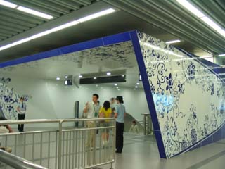 奧運支線共設四個站點,分別為北土城站、奧體中心站、奧林匹克公園站和森林公園南門站。從北土城站到森林公園南門,全長約4.5公里,由南至北橫穿北京奧運會的主要賽場區域。奧運支線是目前國內唯一為乘客提供直飲水系統的地鐵線路。 記者19日上午一走進奧運支線起始站北土城站,立刻被它青花瓷瓶口狀的入口所吸引,走進站臺,滿眼都是青花瓷的大柱子,如此濃郁中國特色的建筑主題引得在場的攝影記者紛紛“咔嚓咔嚓”拍照。而終點站奧林匹克森林公園呈現的則是另一番景象:站臺的頂棚由網狀鋼結構構成,與地面上的鳥巢體育館上下呼應;同時頂棚的鋼網與每一根柱子連接成一體,像一棵棵大樹的樹冠連在一起遮天蔽日,站臺的地面上還“散落”著一片片小楓葉,儼然一個大森林,與森林公園意境相符。 人文奧運的理念更體現在細節的設計上。記者注意到,在奧運支線每一站站臺的玻璃防護門的底部,都印有各種不同的圖案,與每一站的主題相呼應,比如在森林公園站,為了配合森林的主題,圖案是各種各樣的樹;在北土城站,為了配合青花瓷主題,是頗具中國特色的圖案。 與奧運支線“一站一景”不同,10號線體現的是“一線一景”,乳白色的座位,天藍色的扶手,甚至印有“10”的垃圾桶都是統一的,但是每個車站也頗具自身特色。三元橋站由于是和機場快線的中轉車站,專門設計了一面漂亮的彩色“世界地圖”墻,惹得乘客紛紛留影;金臺夕照站密布的紅色和白色的圓形裝飾燈呼應了“夕陽”的主題;而在國貿站,水墨畫的元素被運用其中。