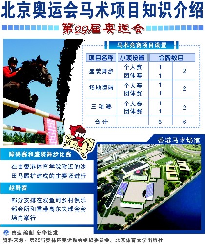 早在公元前680年舉行的古代奧運會就有雙輪馬車比賽。1900年在法國巴黎舉行的第2屆奧運會上,馬術的場地障礙是正式比賽項目之一。1912年,在瑞典斯德哥爾摩舉辦的第5屆奧運會把馬術比賽項目增加到5個。2008年北京奧運會馬術比賽將設置三項賽、場地障礙賽和盛裝舞步賽。每個項目包括個人賽和團體賽兩枚金牌,共有6枚金牌。第29屆奧運會馬術比賽將于2008年8月9日至20日在中國香港舉行。場地障礙賽和盛裝舞步比賽在沙田賽馬場擴建成的主賽場進行;越野賽部分安排在雙魚河鄉村俱樂部會所和香港高爾夫球會會場內舉行。