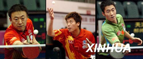 2007年3月25日,中國乒乓球男隊“直通薩格勒布”世乒賽選拔賽第二階段的比賽在遼寧錦州結束。首批6名獲得參賽資格的選手分別是馬琳(左)、郝帥(中)、王勵勤(右)、馬龍、王皓和張超。新華社發