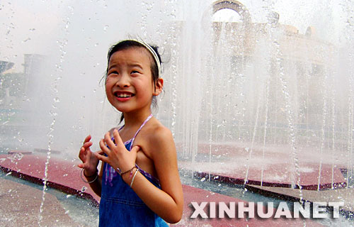 7月24日,一名女孩在噴泉邊淋水消暑。