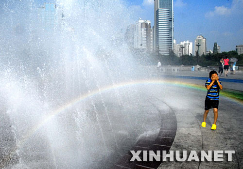 7月24日,一名孩子在上海人民廣場噴水池邊戲水納涼。新華社發