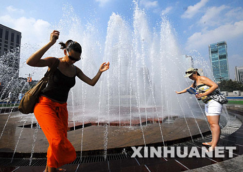 7月24日,兩名外國游客在上海人民廣場噴水池邊戲水納涼。新華社發