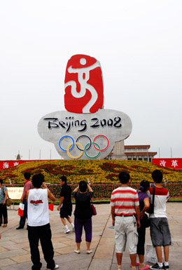當日距北京奧運會開幕還有10天。天安門廣場鮮花盛放,游人如織!拔鑴拥谋本、“五洲四海 喜慶奧運盛會”等花壇將天安門廣場裝飾一新,充滿節日的氣氛。