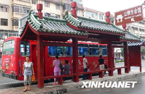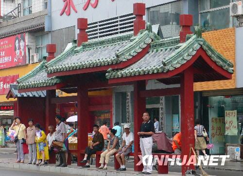 7月30日,乘客在開封街頭的公交候車亭等車。 近日,一批古色古香的候車亭在河南開封街頭投入使用,成為古都開封一道獨特的風景。