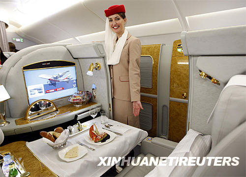 8月1日,在美國紐約肯尼迪國際機場,阿聯酋航空公司的空姐展示首航后的空中客車A380客機頭等艙。新華社/路透