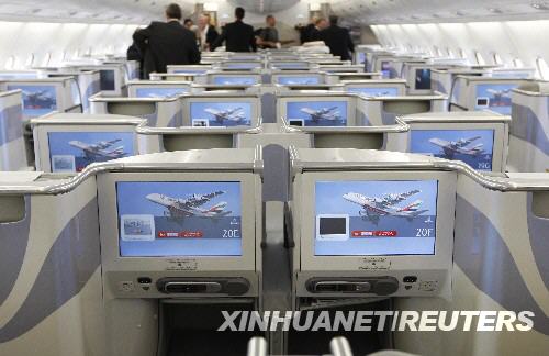 8月1日,在美國紐約肯尼迪國際機場,人們站在首航的阿聯酋航空公司的空中客車A380客機商務艙內。新華社/路透