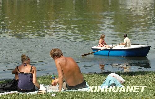 8月4日,在西班牙首都馬德里,兩位游客在雷蒂羅公園的湖邊休息。近日,伊比利亞半島遭遇熱浪襲擊,部分地區最高氣溫已突破40攝氏度。西班牙政府已發出高溫警告,要求居民注意防暑降溫。