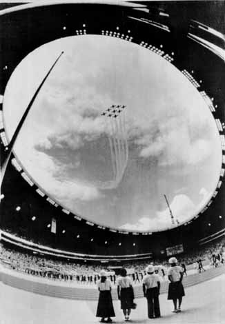 1976年7月17日,蒙特利爾奧運會開幕式上,進行空中特技表演的加拿大皇家空軍噴氣式飛機飛過會場的環形屋頂!