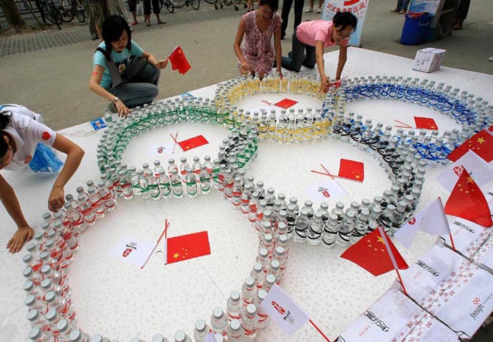 近日,人們在上海街頭用飲料瓶擺出奧運五環的圖案。隨著2008北京奧運會的臨近,上海民眾以多種形式表達對奧運的熱切期盼之情。