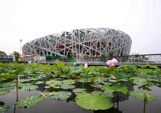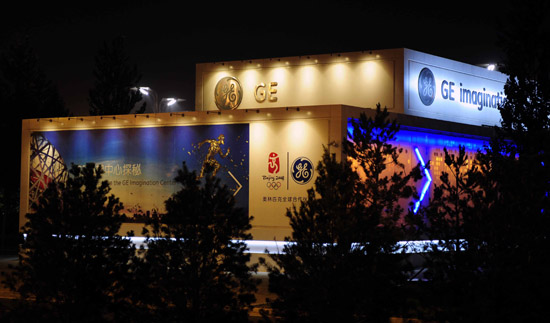 | 連日來,夜幕下的奧林匹克公園熒光束束,包括強生、大眾、通用電器在內的許多北京奧運會合作伙伴企業在奧林匹克公園的公共區內各自加緊打造自己的展示間,用五顏六色的裝飾迎接奧運會的到來。圖為通用電氣公司的展示間。新華社記者