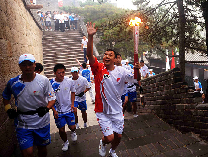 8月6日至8日,北京奧運火炬在京傳遞;鹁媸贮h強在進行火炬傳遞。