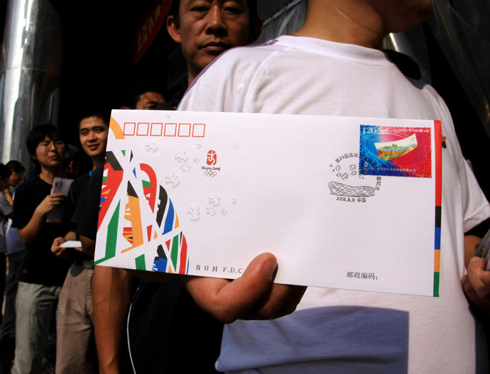 8月8日,合肥市民排隊購買奧運會開幕式相關郵品。當日,《第29屆奧林匹克運動會開幕式》紀念明信片在全國發行。此外,《第29屆奧林匹克運動會開幕紀念》郵票及首日封等同時發售。