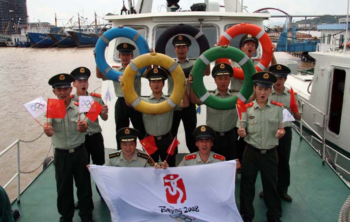 8月8日,在開始海上巡查前,浙江舟山群島邊防官兵在公安邊防艇甲板上用五色救生圈擺出“奧運五環”。當日,浙江舟山群島22個海島邊防哨卡同時舉行升國旗儀式,迎接并祝福北京奧運會。