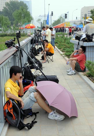 8月8日,眾多攝影記者提前在國家體育場——“鳥巢”南側架好攝影器材,為晚上的開幕式做準備。此刻距北京奧運會開幕還有不到6個小時。