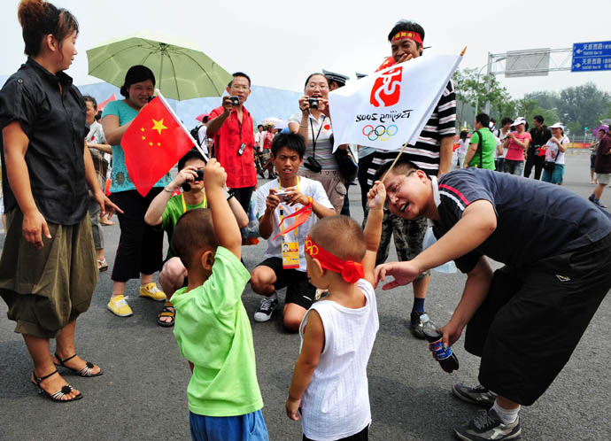 8月8日,游客正在為兩名小男孩拍照。奧林匹克中心區附近張燈結彩、彩旗飄揚,來自海內外的八方賓客歡聚一堂、喜迎奧運。此刻距北京奧運會開幕還有不到6個小時。