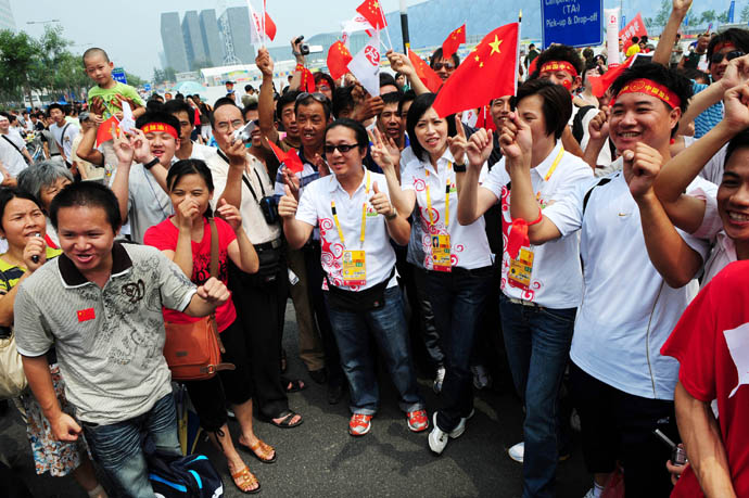 8月8日,許多人聚集在國家游泳中心——“水立方”外歡呼。奧林匹克中心區附近張燈結彩、彩旗飄揚,來自海內外的八方賓客歡聚一堂、喜迎奧運。此刻距北京奧運會開幕還有不到6個小時。