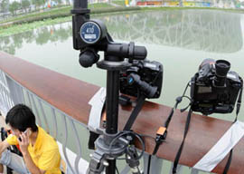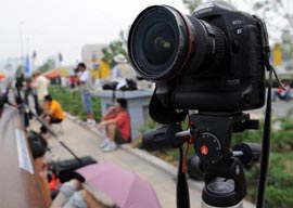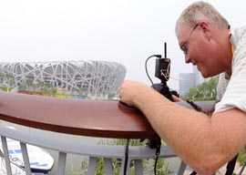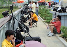 8月8日,眾多攝影記者提前在國家體育場——“鳥巢”南側架好攝影器材,為晚上的開幕式做準備。此刻距北京奧運會開幕還有不到6個小時。