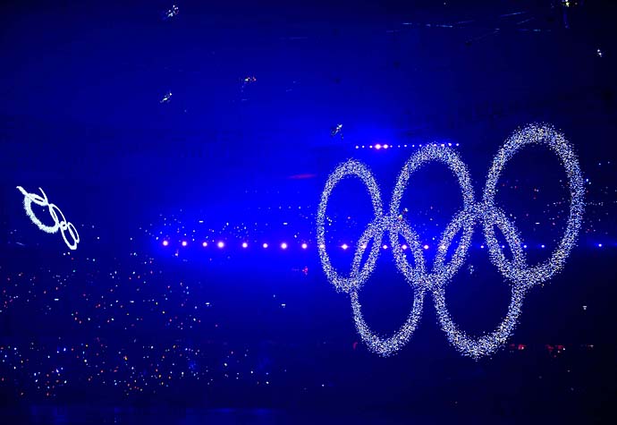 8月8日晚8時,第29屆夏季奧林匹克運動會在國家體育場——“鳥巢”隆重開幕。這是開幕式上閃閃發光的夢幻五環出現在“鳥巢”。