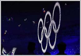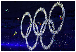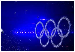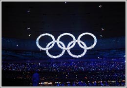 8月8日晚8時,第29屆夏季奧林匹克運動會在國家體育場——“鳥巢”隆重開幕。這是開幕式上閃閃發光的夢幻五環出現在“鳥巢”。