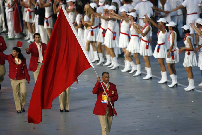 8月8日晚8時,第29屆夏季奧林匹克運動會在國家體育場——“鳥巢”隆重開幕。這是摩洛哥代表團在開幕式上入場。