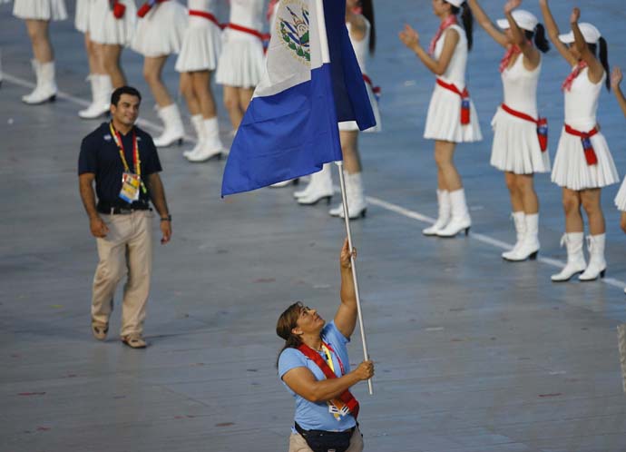 8月8日晚8時,第29屆夏季奧林匹克運動會在國家體育場——“鳥巢”隆重開幕。這是薩爾瓦多代表團在開幕式上入場。