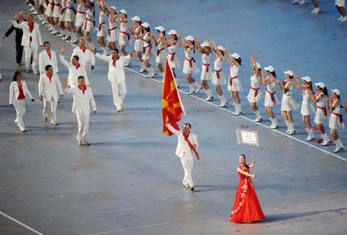 8月8日晚8時,第29屆夏季奧林匹克運動會在國家體育場——“鳥巢”隆重開幕。這是馬其頓代表團在開幕式上入場。