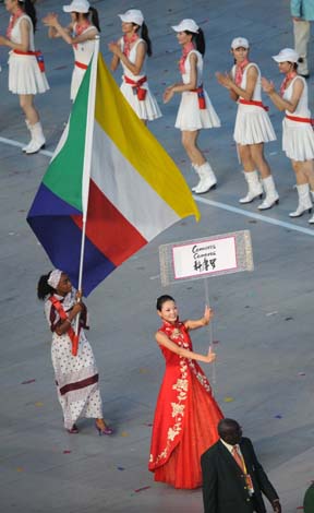 8月8日晚8時,第29屆夏季奧林匹克運動會在國家體育場——“鳥巢”隆重開幕。這是科摩羅代表團在開幕式上入場。