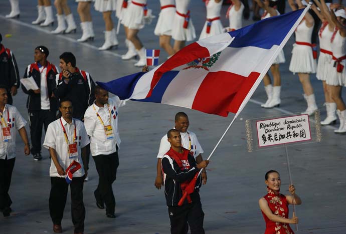 8月8日晚8時,第29屆夏季奧林匹克運動會在國家體育場——“鳥巢”隆重開幕。這是多米尼加代表團在開幕式上入場。