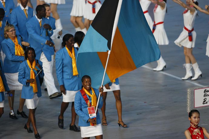 8月8日晚8時,第29屆夏季奧林匹克運動會在國家體育場——“鳥巢”隆重開幕。這是巴哈馬代表團在開幕式上入場。