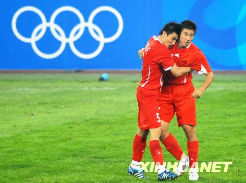 8月7日,中國國奧隊球員李瑋峰(左)與隊友董方卓一同慶祝進球。當日,在沈陽進行的北京奧運會男子足球C組的比賽中,中國國奧隊以1比1戰平新西蘭國奧隊。新華社記者