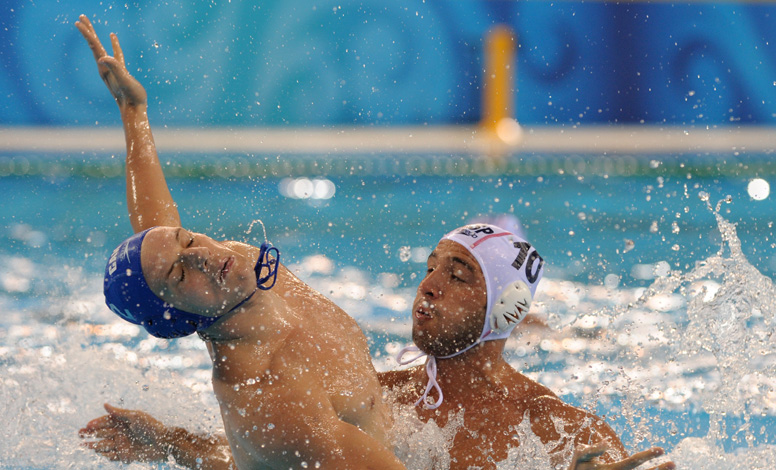 8月10日,在北京奧運會男子水球預賽中,西班牙男子水球隊迎戰加拿大男隊,西班牙隊球員費利佩·佩羅內(右)和加拿大隊球員康斯坦丁·庫達巴 在水中“優雅”地拼搶,宛如陶醉共舞,讓人莞爾。