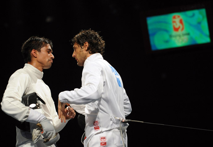 8月10日,委內瑞拉選手西爾維奧·費爾南德斯(左)在賽后與匈牙利選手博茨科·加博爾握手。當日,在北京奧運會擊劍男子重劍個人1/8決賽中,此前排名世界第一的委內瑞拉選手西爾維奧·費爾南德斯負于匈牙利選手博茨科·加博爾,無緣八強。