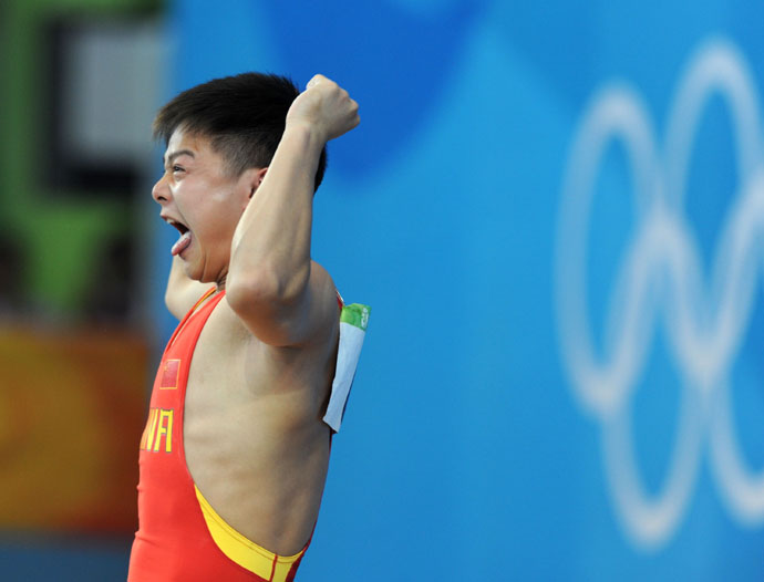 8月10日,中國選手龍清泉慶祝勝利。當日,中國選手龍清泉在北京奧運會男子舉重56公斤級決賽中以292公斤的總成績獲得金牌,并以132公斤的抓舉成績打破世界青年紀錄。