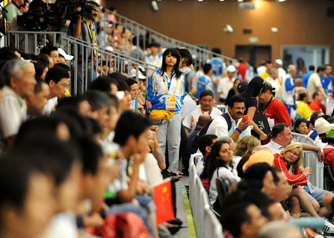 8月11日,志愿者在賽場內“監督”觀眾文明觀賽。
