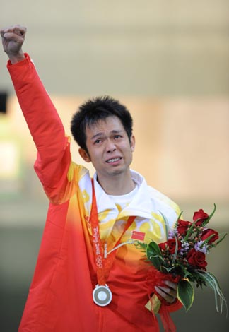 8月11日,中國選手朱啟南在頒獎典禮上滿含熱淚。當日,北京奧運會射擊男子10米氣步槍決賽在北京射擊館舉行,中國選手朱啟南以699.7環的成績獲得亞軍。