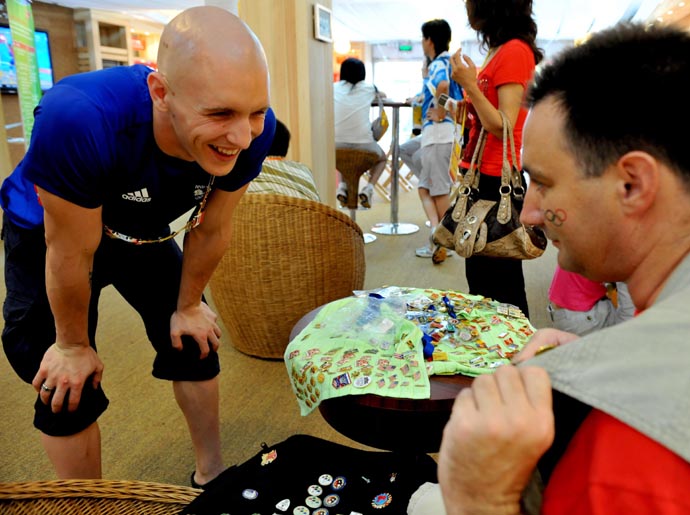 8月11日,英國運動員尼古拉斯·羅賓遜-貝克(左)在北京奧運村紀念章交換中心看到一枚自己喜歡的徽章。