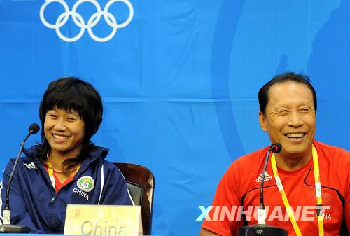 | 8月11日,中國女足主教練商瑞華(右)和球員韓端在新聞發布會上。新華社記者