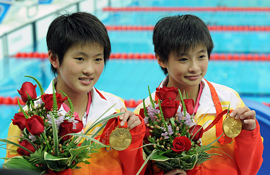 除了“完美”,你幾乎找不到更好的詞匯,來描繪12日王鑫和陳若琳的表現。 16歲的青春年華,“水立方”的夢幻空間,第一枚奧運金牌的滋味,以及毫無瑕疵的奪金過程,這一切,都太過美妙。 在“水立方”,開闊的空間,供她倆似小燕自由翻飛,碧藍的水池,供她倆如小鴨優雅嬉戲。1萬多名觀眾匯聚起來的掌聲和吶喊,全部獻給這兩位10米高臺上的天使。 就在前一天,王鑫剛剛度過16周歲的生日。比賽結束后,王鑫的小臉燦若桃花,她說:“這枚金牌,是我16年來得到的最珍貴的生日禮物。獲得奧運會金牌,也當然是我一直以來的愿望! 比王鑫小4個月零一天的陳若琳則說:“其實我們和國外選手的實力都差不多,主要要靠平時苦練! 讓我們重溫這對中國“小丫”完美摘金的過程: 北京奧運會女子雙人10米跳臺決賽于14時30分開始。在8對參賽選手中,王鑫/陳若琳第五個出場。她倆的動作難度系數為13.6,僅列第四,但了解她們的人都知道,這并不是問題?∏蝺灻赖目罩凶藨B,形同一人的默契配合,微弱細小的入水水花,才是她倆的制勝武器。 第一跳,55.80分,名列第一,其中一名同步分裁判給出了10分; 第二跳,55.20分,再列第一,其中一名技術分裁判給出了10分; 接下來的三個動作,同樣無懈可擊,同樣得到最高分。最終,王鑫/陳若琳以363.54分的總成績高居榜首,比第二名高出了28.38分。 王鑫/陳若琳獲得的這枚金牌,也延續了中國跳水“夢之隊”在女雙10米跳臺這個項目上的輝煌。悉尼奧運會上是李娜/桑雪,雅典奧運會上是李婷/勞麗詩,自雙人跳水項目于2000年進入奧運會以來,中國隊從未讓女雙10米跳臺這枚金牌旁落。 第一次參加奧運會,為何能在比賽中表現得如此冷靜呢?王鑫說:“訓練時教練讓我們放松,其實沒必要把奧運會看得太過重要,我們需要做的就是放平心態,放松地去跳! 王鑫告訴記者,11日是生日,自己并沒搞什么慶;顒,也沒許什么愿,但還是收到了隊友們送的很多禮物,有衣服、項鏈等等。記者問:“陳若琳送了什么?”王鑫答:“她送給我友誼! 對于奪冠的秘訣,有些靦腆的陳若琳說:“我們并沒有什么特別的心理訓練,只是把平常的訓練當作比賽來跳! 不能不說的是,像任何一位奧運冠軍一樣,王鑫、陳若琳同樣走過了艱辛的人生道路。王鑫是湖北人,最初練體操,8歲背井離鄉進入清華跳水隊,此后又輾轉來到天津跳水隊進行訓練。來自江蘇南通的陳若琳一直是中國跳水隊中訓練最刻苦的隊員之一,身體的發育曾讓她頗為苦惱,為了減體重,她不得不強力克服小姑娘嘴饞的天性,“餓了,就睡覺”。 過人的天資加上百倍的付出,讓王鑫和陳若琳自2007年配對以來,連續獲得2007年世界跳水系列賽全部3站、2008年世界杯賽以及多次國際泳聯大獎賽的冠軍,成為公認的女雙跳臺世界第一組合。 20日,王鑫、陳若琳將以對手的身份參加單人跳臺項目的角逐。王鑫說:“我們會互相幫助,希望我倆都取得好成績!