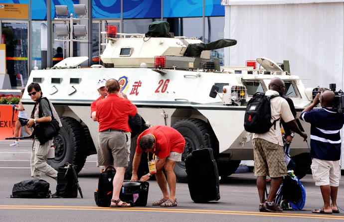 8月12日,記者在拍攝裝甲運兵車。當日,一輛安保裝甲運兵車停在北京奧運會新聞中心(MPC)安檢口,成為媒體關注的焦點。許多記者還饒有興趣地與之合影留念,感受一下這位“裝甲明星”的威風。