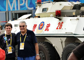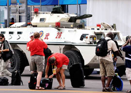 8月12日,,一輛安保裝甲運兵車停在北京奧運會新聞中心(MPC)安檢口,成為媒體關注的焦點。許多記者還饒有興趣地與之合影留念,感受一下這位“裝甲明星”的威風。