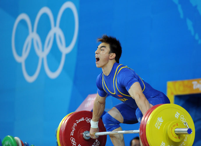 8月12日,中國運動員廖輝在比賽中。當日,廖輝在北京奧運會舉重男子69公斤級決賽中以348公斤的總成績獲得金牌。