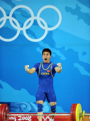 8月12日,中國運動員廖輝在比賽中慶祝。當日,廖輝在北京奧運會舉重男子69公斤級決賽中以348公斤的總成績獲得金牌。