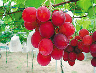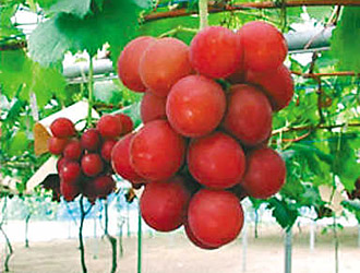 這張日本石川縣政府在8月12日提供的拼版照片展示了石川縣金澤市一個農業試驗基地的新品種優質葡萄“羅馬紅寶石”。這種優質葡萄11日在日本市場首次推出,其中重700克、有35粒的一串葡萄以10萬日元(約合910美元)的價格創下日本葡萄拍賣最高紀錄。新華社/法新
