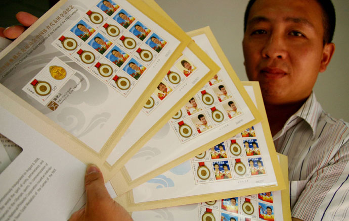 8月13日,安徽巢湖的一名集郵愛好者展示購買到的“金牌運動員”即時版個性化郵折。中國集郵總公司在北京奧運會期間發行“金牌成就夢想”第29屆奧林匹克運動會中國體育代表團奪金紀念郵品(簡稱“金牌運動員”郵品),包括“金牌運動員”即時版個性化郵折和“金牌運動員”紀念封,個性化郵折力爭在運動員獲得金牌后48小時內發行銷售,受到廣大集郵愛好者的青睞。