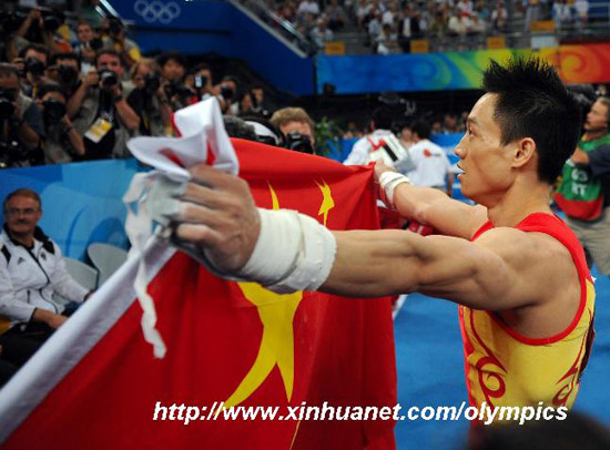 8月14日,中國選手楊威在奪冠后手持五星紅旗慶祝。當日,在國家體育館舉行的北京奧運會男子個人全能決賽中,中國選手楊威以94.575分的成績奪得冠軍。 新華社記者