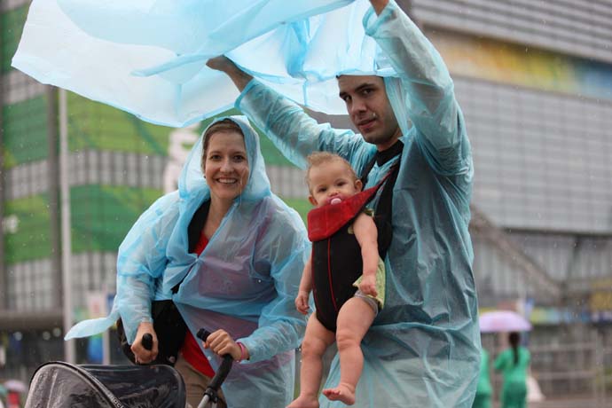 8月14日,一個外國家庭在雨中游覽奧林匹克公園。