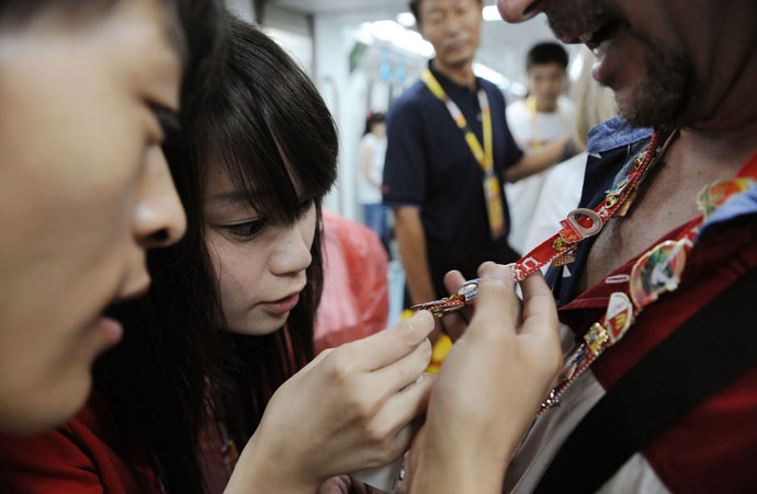 8月14日,在北京地鐵里,人們被美國“章迷”的奧運紀念章所吸引。奧運會,也是來自世界各地的奧運紀念章迷們的盛會。大家在北京互換紀念章,“以章會友”,共同享受奧運帶來的快樂。