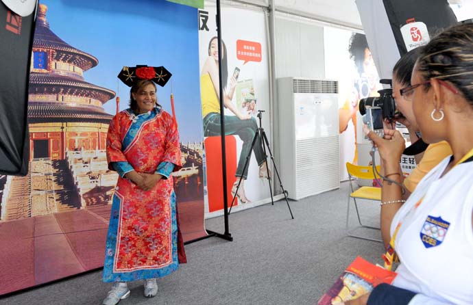 8月14日,來自薩爾瓦多的賓客在北京奧運村商業文化街身穿中國古代服飾拍照留念。