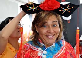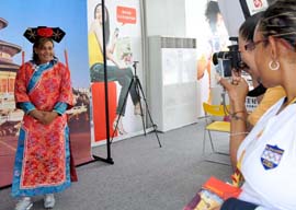 北京奧運村商業文化街照相館里的中國古代服飾受到外國賓客的青睞。