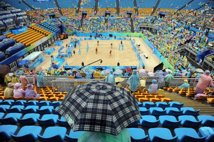 8月14日,觀眾在朝陽公園沙灘排球場冒雨觀看比賽。當日,北京奧運會沙灘排球小組賽在這里舉行,盡管北京降雨,卻依然擋不住沙排球迷的熱情。